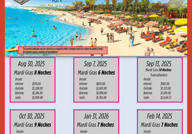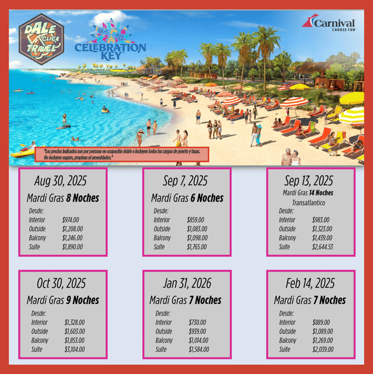 ¡Atención, fans de @CarnivalCruise! 🚢✨ En el #MardiGras, estamos contando los días para la apertura de Celebration Key. 🌴🌊 Para más detalles, visita daleclick.travel o mándame un DM. ¡Nos vemos a bordo! 🏖️ #CarnivalCruise #CelebrationKey