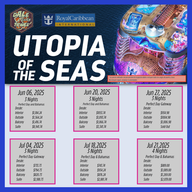 ¡Zarpa hacia la diversión en Utopia of the Seas! 🌊🌴 Verano, sol y aventura desde solo $733.73 por persona. ¿Listo para navegar? Más info en daleclick.travel ⛵🔥 #Crucero #VacacionesPerfectas
