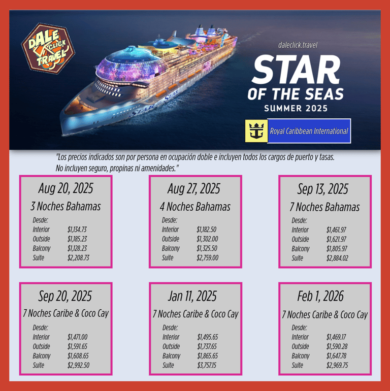 🚢✨ ¡Embárcate en una aventura épica con el Icon of the Seas! 🌴🌊 Disfruta de itinerarios desde 3 noches por el Caribe & Bahamas, incluyendo la espectacular isla privada Perfect Day at CocoCay. Salidas desde Miami 🔗 daleclick.travel 📩 omar@daleclick.travel 📞 321-663-5422